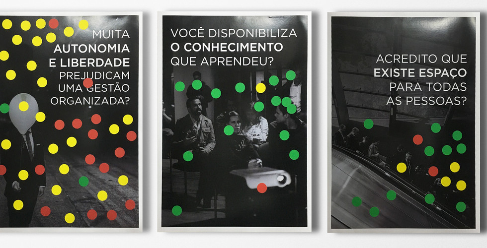 Também criamos uma pesquisa interativa a partir de cartazes com perguntas relacionadas ao mundo do trabalho. Pedíamos para que as pessoas respondessem: o verde significa “sim”, o amarelo “depende”, e o vermelho é “não”.